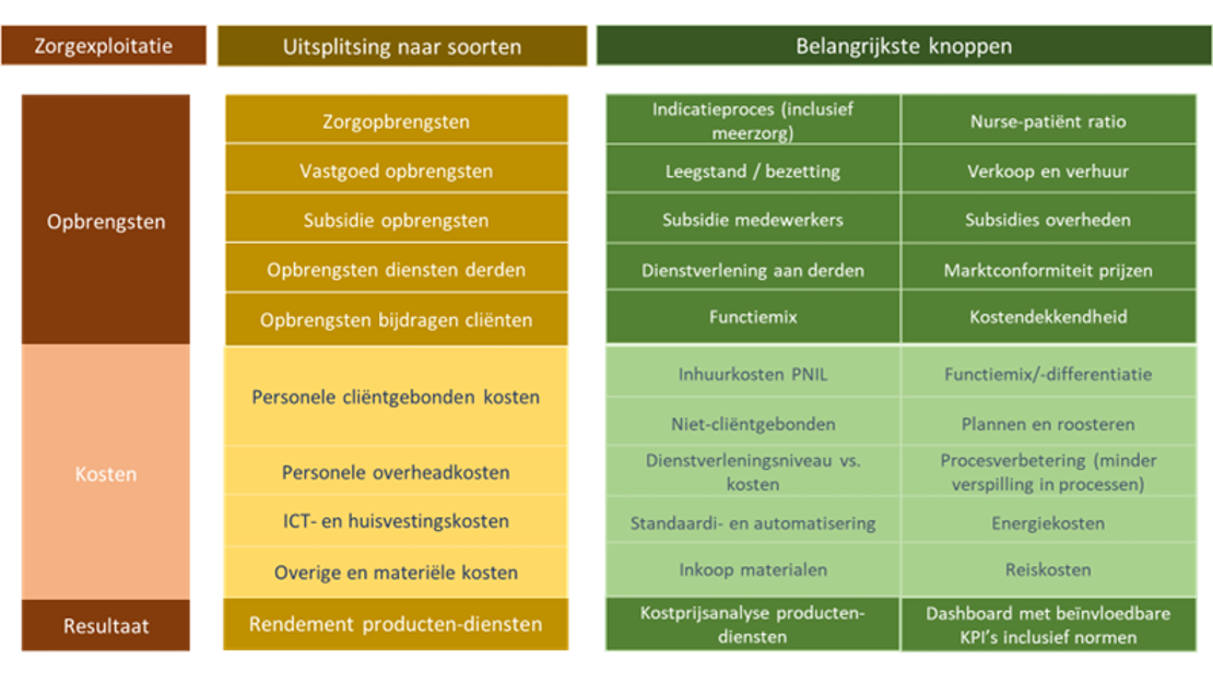 Het stappenplan is gebaseerd op een denkkader dat Berenschot ontwikkelde mede op basis van inzichten uit de Benchmark Care (zie figuur). Daarin is te zien via welke 'knoppen' zorgorganisaties hun opbrengsten en kosten kunnen beïnvloeden.