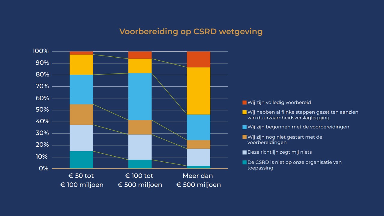 Uit het onlangs door ons uitgevoerde Strategie Trendsonderzoek blijkt echter dat een ruime meerderheid van de organisaties die moet voldoen aan deze aankomende wetgeving niet volledig is voorbereid. Met name organisaties met een jaarlijkse omzet tot €500 miljoen zijn óf nog onbekend met de CSRD-wetgeving óf pas in de beginfase van de uitwerking hiervan.