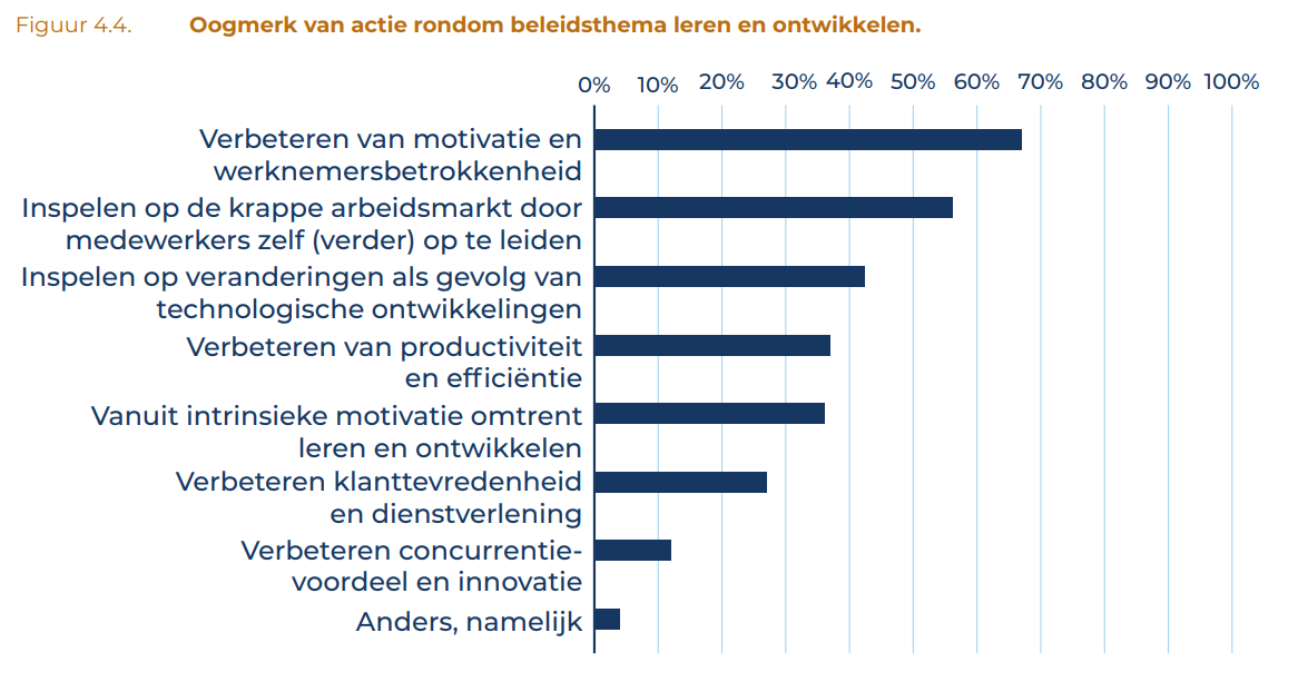 De voornaamste reden voor organisaties om aan de slag te gaan met Leren en ontwikkelen is het verbeteren van motivatie en werknemersbetrokkenheid (67%). Daarnaast is inspelen op de krappe arbeidsmarkt (56%) een vaak genoemd argument om hierin te blijven investeren.