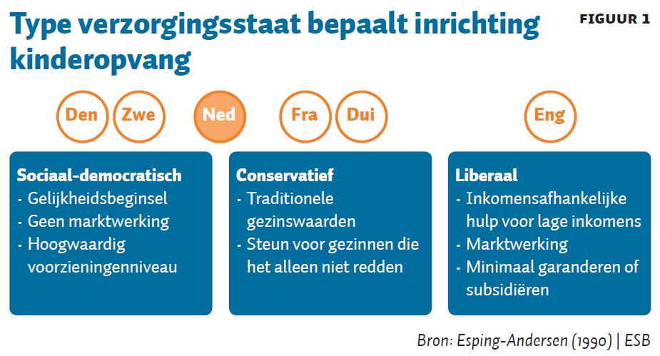 In het Angelsaksische model (het liberale type verzorgingsstaat) zijn de collectieve voorzieningen beperkt. De kinderopvang in Engeland wordt vergoed voor het meest kansarme deel van de bevolking. De Scandinavische landen in de vergelijking zijn een voorbeeld van een sociaal-democratische verzorgingsstaat. In dit model zorgt de staat voor sterk herverdelende voorzieningen en uitkeringen, die ervoor zorgen dat iedereen een gelijke kans heeft.