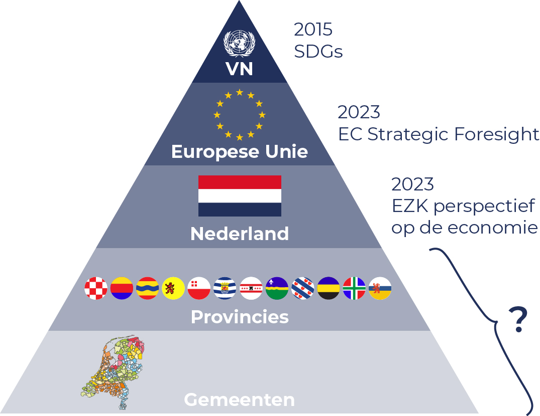 Eerder al adopteerden andere overheidslagen het gedachtegoed van brede welvaart als bril om naar de economie te kijken. Zo stelde de Verenigde Naties in 2015 de Sustainable Development Goals (SDGs) op om richting 2030 een verhoogd welzijn voor mens en planeet te bereiken. En de Europese Commissie lanceerde in juli 2023 het idee om welzijn en welvaart met elkaar in overeenstemming te brengen (‘reconciling wellbeing and prosperity’) in de publicatie Strategic Foresight 2023: Sustainability and people’s wellbeing at the heart of Europe’s Open Strategic Autonomy.