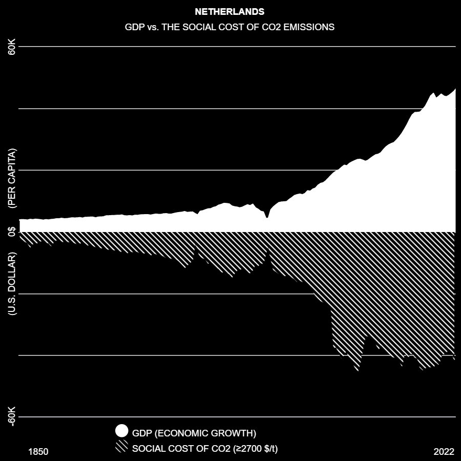 Met andere woorden: de waarde die de Nederlandse economie creëert wordt vrijwel geheel ongedaan gemaakt door de sociale kosten van de CO2-uitstoot die dit veroorzaakt. Je zou dit het Nederlandse schaduw-bbp kunnen noemen. En dan is er in deze analyse nota bene alleen gekeken naar de sociale kosten van CO2-uitstoot, terwijl alle andere verborgen kosten van de Nederlandse economie buiten beschouwing zijn gebleven (zoals welvaartsziekten, verlies aan biodiversiteit, enzovoorts).