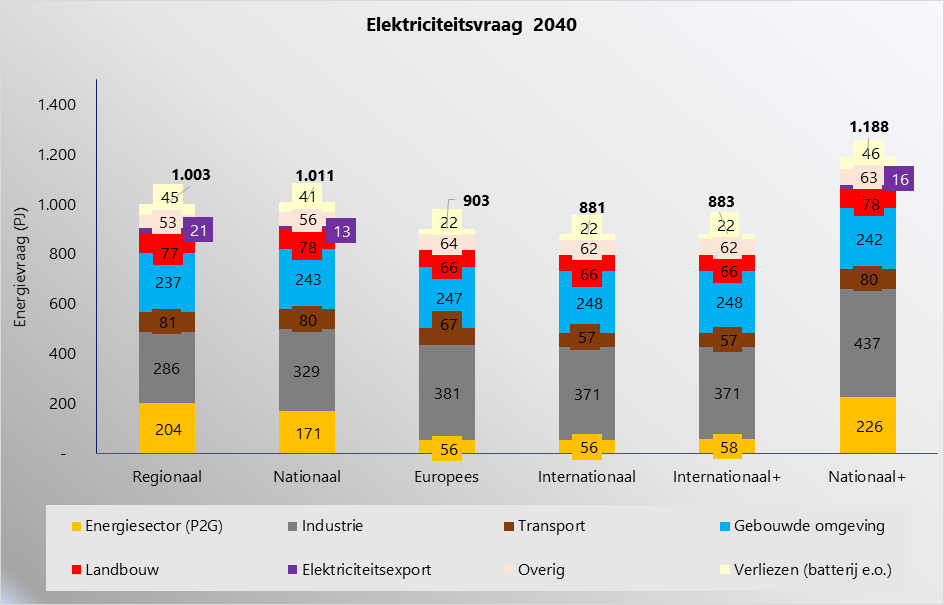 Omdat binnen de scenario’s bepaalde elementen nog ontbraken, hebben we twee varianten toegevoegd (een variant op het scenario Nationaal waar de industrie zeer sterk inzet op elektrificatie en een variant op het scenario Internationaal waar ook 38,5 GW wind op zee wordt gerealiseerd ten behoeve van meer productie groene waterstof), waardoor er uiteindelijk met zes 2040 energiescenario’s gerekend is.