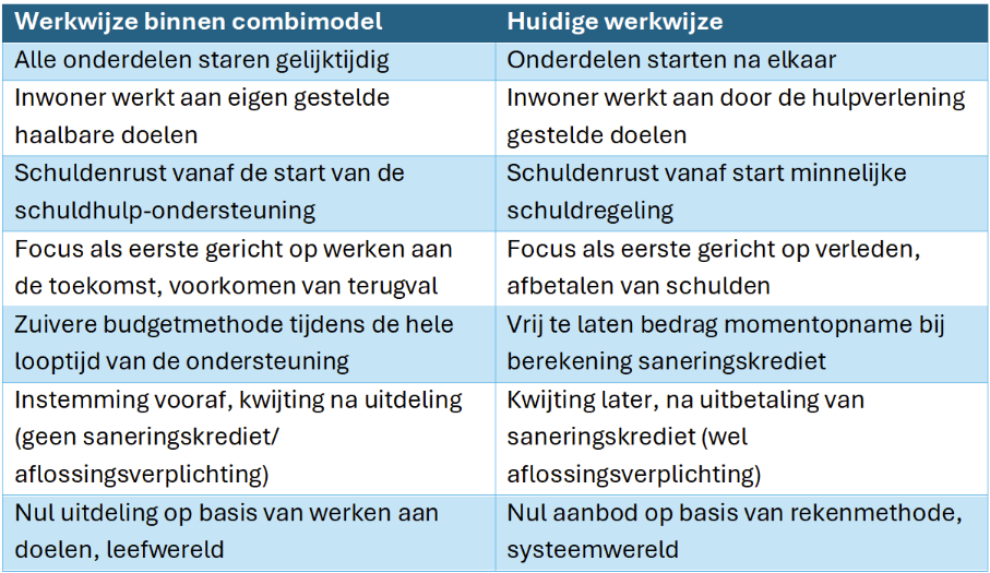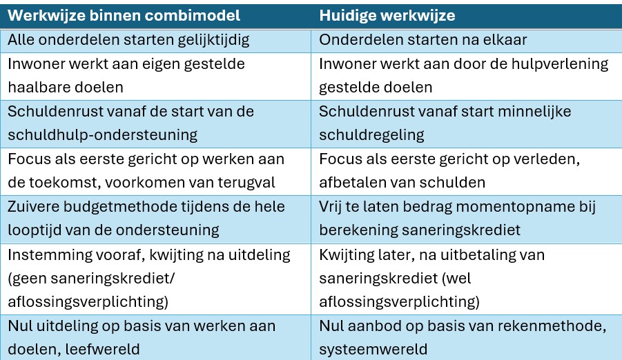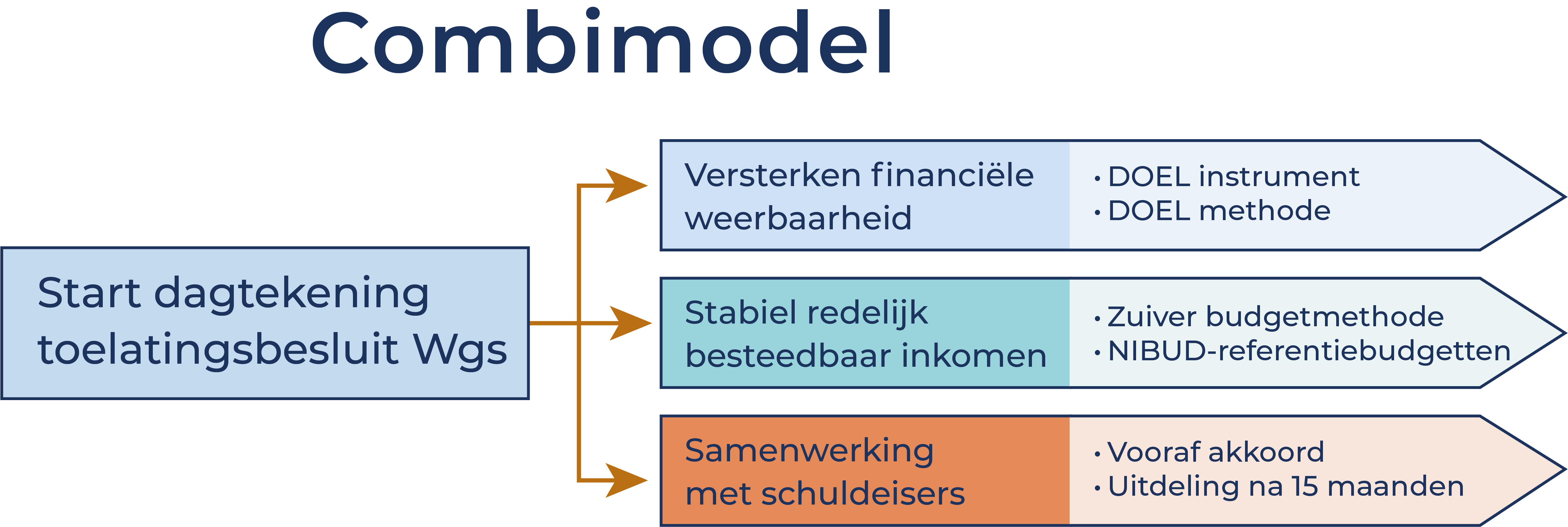 Anders dan in de huidige werkwijze beginnen de drie onderdelen van het combimodel tegelijkertijd. De kern is dat inwoners met problematische schulden werken aan zelfgekozen doelen, daarbij persoonlijke en warme ondersteuning krijgen, leven van een reëel en haalbaar budget en een voor hun situatie verantwoord bedrag voor schuldeisers sparen. Daarmee maakt alle inzet van de inwoner vanaf de intake deel uit van het minnelijk traject van 18 maanden, en dat geldt ook voor de samenwerking met schuldeisers. Na aanmelding en afgifte van de toelatingsbeschikking Wet gemeentelijke schuldhulpverlening gaan de drie stappen tegelijk van start.