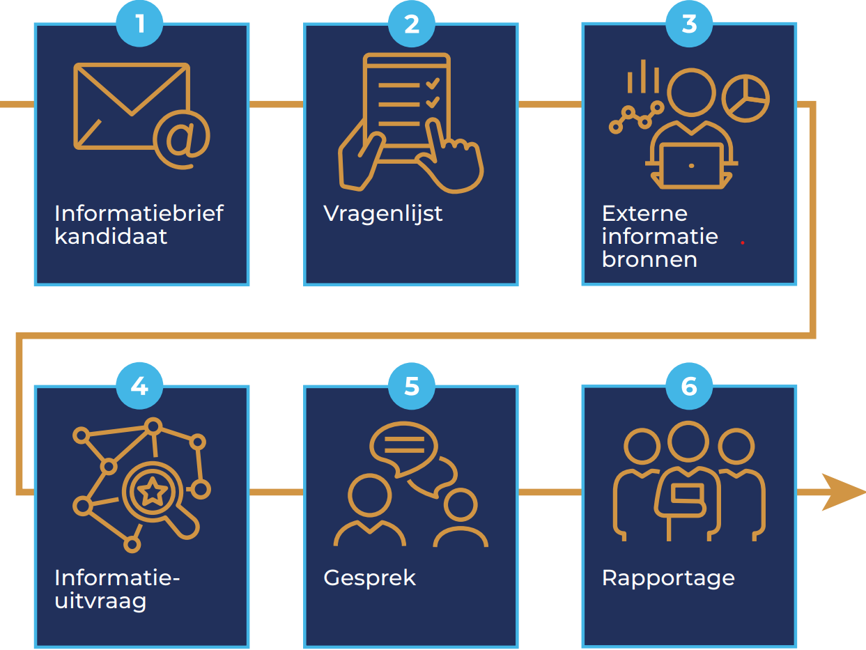 • Zodra de kandidaten bekend zijn, kunnen wij van start gaan. Indien gewenst kunnen wij de risicoanalyse voor een kandidaat, maar ook voor een heel college binnen één week uitvoeren.