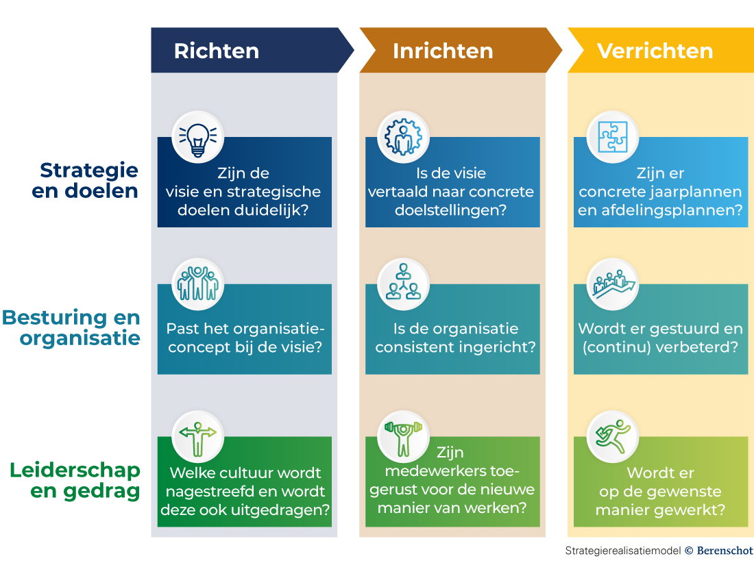 Ten eerste het formuleren van de strategie met duidelijke doelen, een heldere visie en daaraan gerelateerde (culturele) waarden. Dat vormt de basis voor de organisatie-inrichting, via een vertaling in strategische doelstellingen, een inspirerend organisatieontwerp en bijbehorende (leiderschaps)competenties.